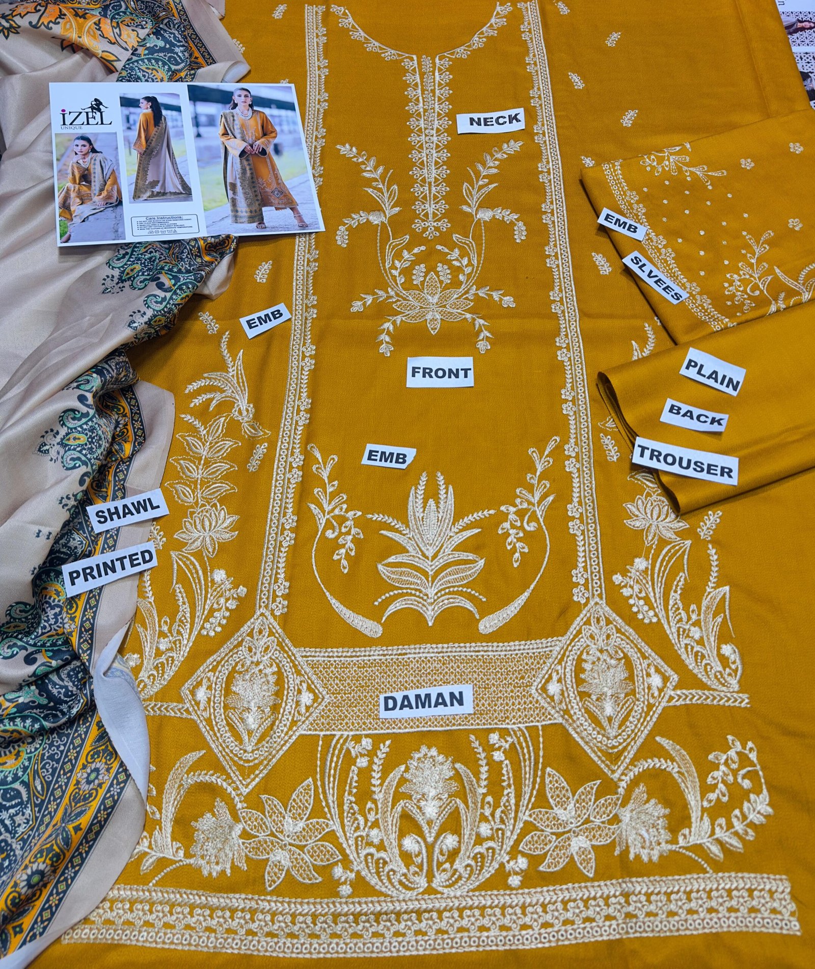 •Embroidered Dhanak front •Embroidered Dhanak sleeves •Printed 2.5 Meter Wool Shawl •Dyed Dhanak trouser